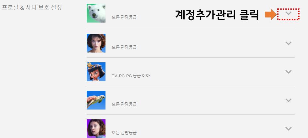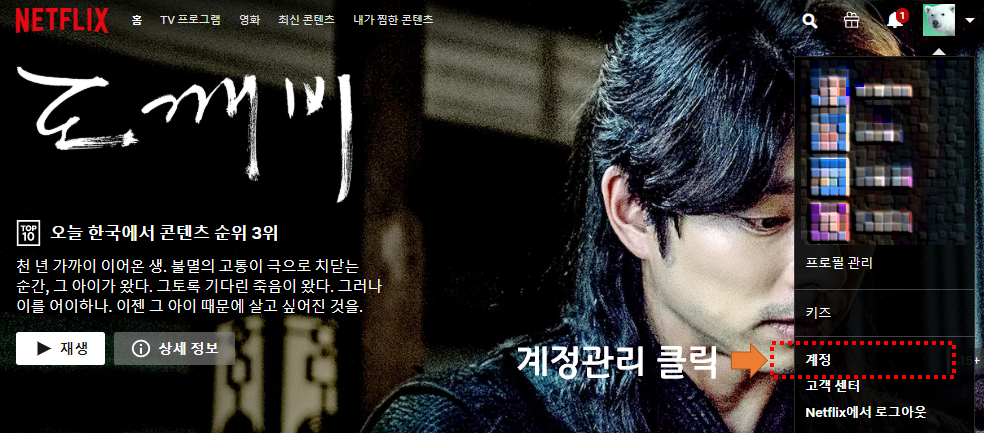 우선 넷플릭스 홈페이지로 이동을 해서 자신이 넷플릭스 프로필중 아동용 계정이 아닌 프로필을 하나 클릭합니다. 아동용 계정의 경우는 계정관리를 해줄 수 있는 기능이 없는 관계로, 혹시라도 아동 계정으로 들어가셨을 경우 다시 빠져나가서 비아동계정으로 들어가시길 바랍니다.