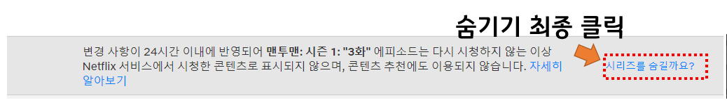 클릭을 하면 그냥 지워지는 것이 아니고 경고 메세지가 한번 뜨면서 '시리지를 숨길까요?'를 다시한번 클릭해야지 시청 기록에서 완전히 사라지게 됩니다. 참고로 시리즈에 대한 영상은 전체 시리즈가 한꺼번에 숨겨지게 됩니다.
