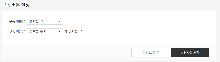 메뉴 하단에는 구독 버튼 설정을 정할 수 있으며, 우선 버튼 표기를 '표시합니다.'로 바꾸시고, 구독 버튼 표기 위치 선정하시면 됩니다. 미리보기를 통해서 자기 사이트에 어떤 식으로 노출되는지를 보시고 변경사항 저장하시면 됩니다.