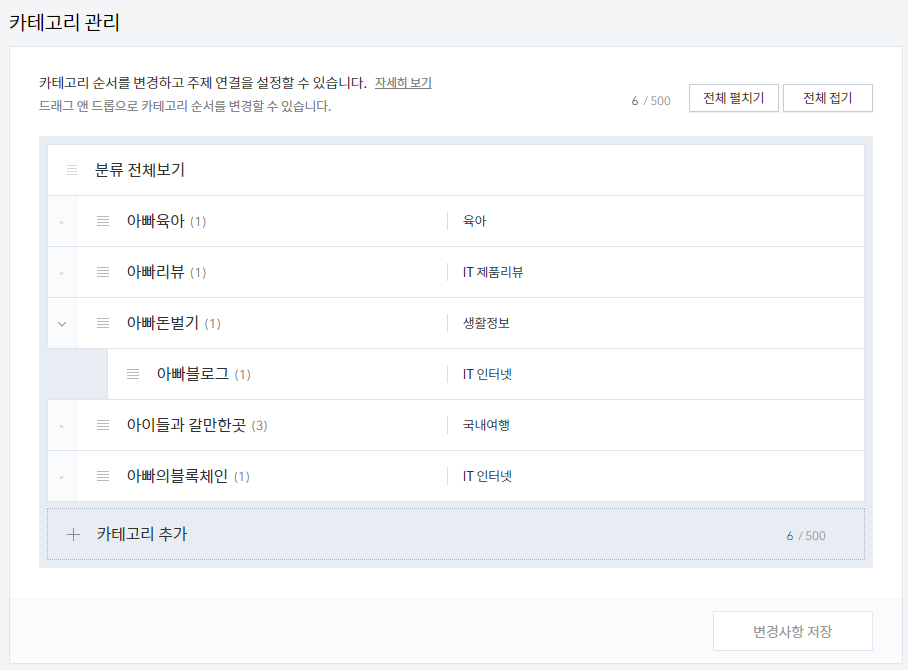 글을 쓰게 되면 카테고리 없이 글을 배포할 수 있지만, 보통은 어느 카테고리에 넣어서 구독자들이 원하는 글들을 쉽게 찾을 수 있도록 정합니다. 카테고리는 하위 카테고리까지 세팅이 가능하며 카테고리 추가를 통한 후 마우스로 하위 카테고리의 경우는 위치를 끌어서 변경하면 됩니다. 각 카테고리별로 주제를 따로 정해줄 수 있는데, 이는 티스토리의 경우는 다음에서 자동으로 검색이 되는 관계로 다음에 추가 정보를 줄 수 있는 하나의 방법입니다.
