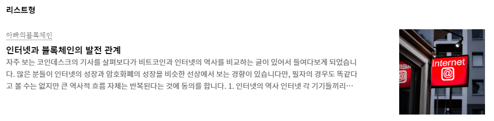 - 리스트형 : 카테고리, 제목과 본문의 첫부분이 노출되며, 오른쪽에는 사진이 보이는 형태로 나열됩니다. 추가글은 밑으로 나열됩니다.