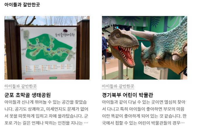 상단에 있는 스크린샷은 벽돌 리스트 커버 아이템을 이용했으며 카테고리는 제 블로그의 "아이들과 갈만한 곳"이라는 카테고리의 글만 따로 지정해서 홈페이지에 보이도록 노출했습니다.