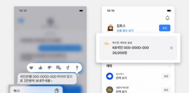 계좌번호를 모르더라도 연락처만 있으면 송금할 수 있으며 사기 계좌 조회및 송금 메세지등을 전달 할 수 있습니다. 특히 공인인증서와 같은 보안 장치 없이도 송금이 된다는 장점이 있습니다. 한가지 실제로 매우 편리한 기능은 스마트폰에서 받은 문자나 메세지내에서 전달되는 계좌 정보의 경우는 자동으로 앱에서 인식을 해서 자료를 넘겨받고 송금을 준비해준다는 것입니다. 즉, 따로 계좌번호와 같은 것을 입력하지 않고도 금액과 송부처까지 자동 입력이 가능한 기능입니다. 정말 이 기능을 사용할때는 토스의 뜻을 그대로 이어 받은 느낌입니다.