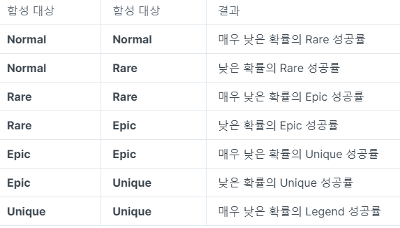 - 합성: 스텝엔과는 달리 신발의 레리티를 올릴 수 있습니다. 합성을 성공했을때 한단계 높은 등급이 될 수 있으나, 실패시 패널티가 상당히 높은 편입니다. 합성 성공시에는 사용했던 신발은 사라지는 개념이 아니라 레리티가 상향되는 형태의 합성입니다.