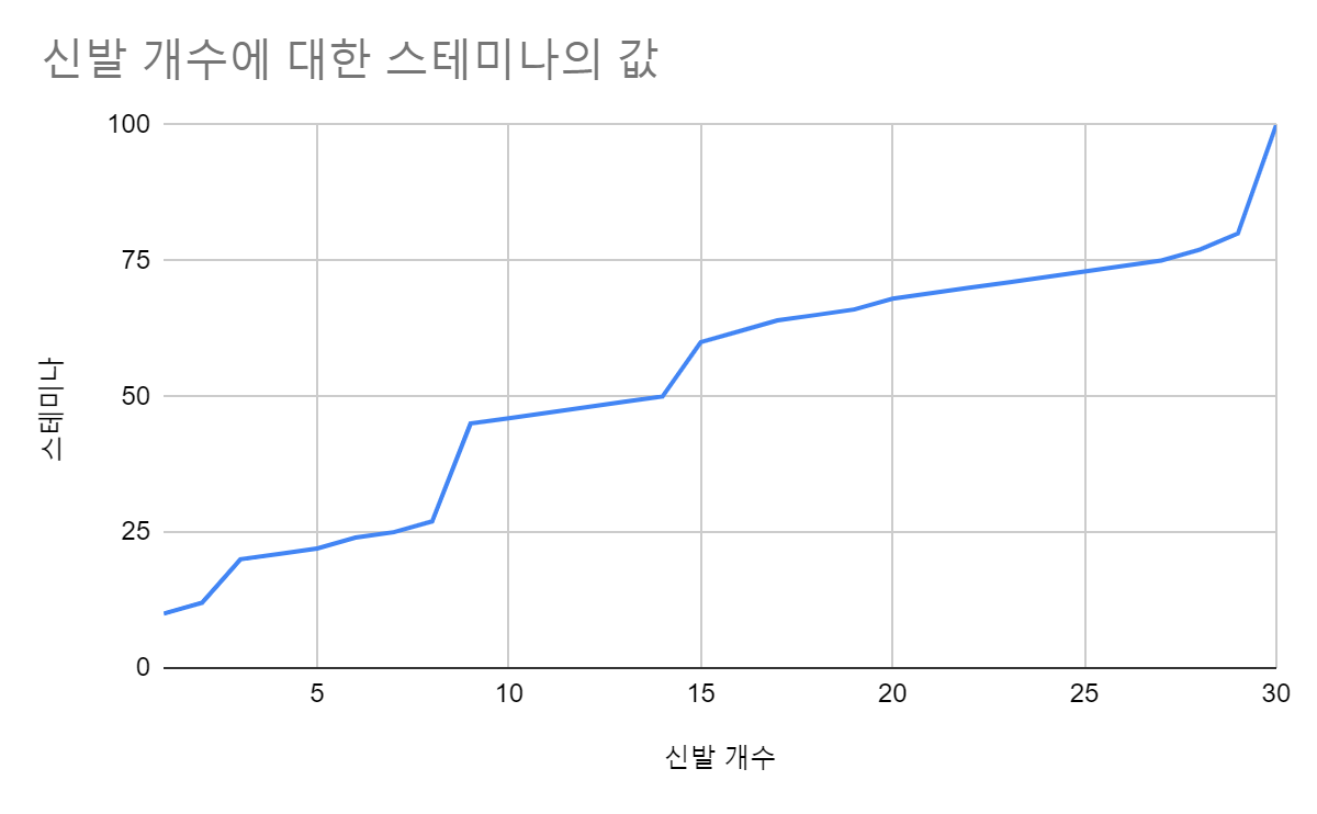 - 신발의 개수는 최대 30개까지 소유할 수 있으며, 소유한 신발에 따라 스테미나 변화가 있습니다. 스니커즈의 경우는 신발을 하나라도 더 가지고 있을 경우 모든 신발에 대한 스테미나를 부여해줍니다. 1 스테미나는 1분으로 환산되고 있습니다. 특히 9개, 15개와 30개 소유시 단계적 상승폭이 가장 큽니다.