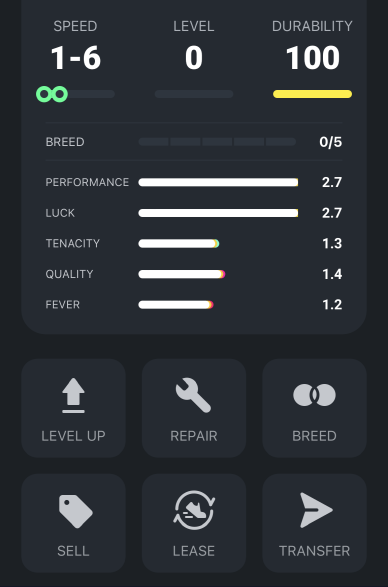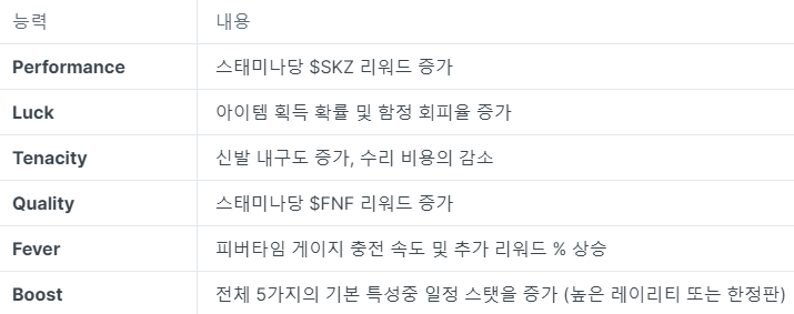 - 신발의 능력치중 가장 핵심적인 것은 채굴능력을 보여주는 Performance와 신발 내구도를 결정짓는 Tenacity입니다. 이외에 Luck은 아이템이 드랍되는 확률과 Quality는 거버넌스 토큰 채굴에 따른 향상을 도와줍니다. Fever는 새로운 개념으로 충전 속도나 리워드를 일시적으로 높여주는 역할입니다.