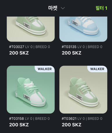 - 브리딩: 두개의 신발을 이용해서 새로운 슈박스를 민팅할 수 있음며, 사용하는 신발의 레리티에 따라서 슈박스의 레리티 %가 정해짐