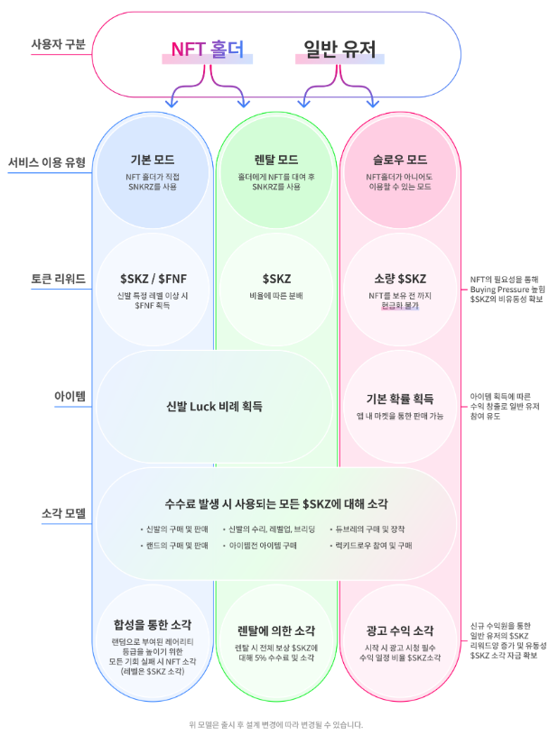 우선 SNKRZ는 NFT보유자와 미보유자로 구분해서 참여를 할 수 있습니다. 렌딩 마켓도 같이 계획이 되어 있어서, 직접 NFT를 구매하지 않고 빌려서 수수료를 내고 사용하는 방법도 있습니다. 완전 무료 사용의 경우는 NFT없이 걸으면서 소량의 SKZ를 채굴 할 수 있으나, 출금은 불가능합니다. 대신에 SKZ를 계속 모아서 이후 시장에서 신발을 구매할 수 있습니다. 무료 참여 모드의 경우는 광고 시청을 통한 재원 마련이 됩니다.