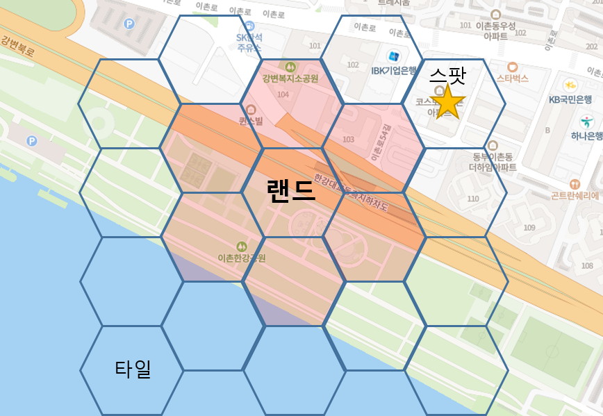 스니커즈는 메타버스적 접근으로 실세계에 대한 부동산을 스니커즈에 적용을 하고 있습니다. 개념적으로는 랜드, 타일과 스팟이라는 명칭들이 사용되며, NFT적 개념은 랜드이며, 랜드는 육각형의 여러개의 타일이로 이루어졌습니다.