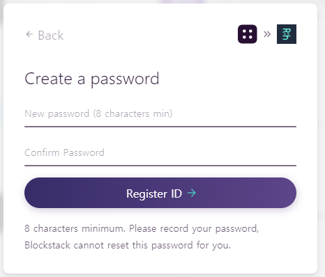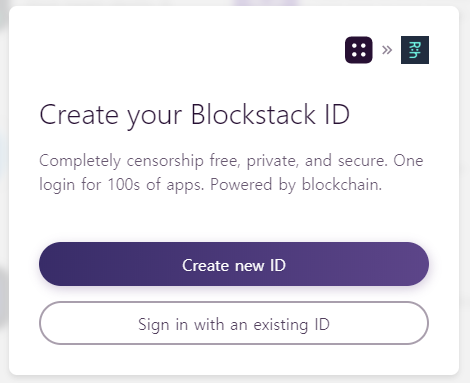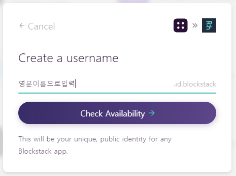 블록스택 생성 화면이 나오면 Create new ID를 누르시고 아이디명을 영문으로 입력하시면 됩니다. 이 아이디를 이용해서 같은 브라우저에서는 쉽게 재로그인이 가능하고, 그 외에는 문자형 암호를 입력해서 재로그인이 쉽게 되십니다. 영문이름을 넣으시고 체크를 해보시면 가능할 경우 녹색으로 Username Available이라고 뜨면서 Continue를 누를 수 있습니다.