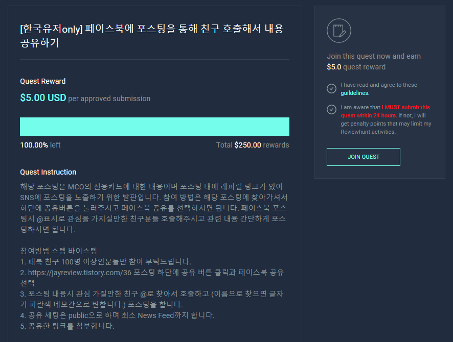 지금 제가 직접 올려서 운영하고 있는 마케팅 퀘스트는 한국인 전용이라서 예를 들어 사용을 해보겠습니다. 간단하게 페이스북에 친구 5명 호출해서 포스팅 링크 공유를 해주고 증거 화면 제출하면 되고, 2분만 하고 5불 (약 6천원)을 벌 수 있습니다.