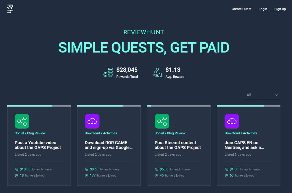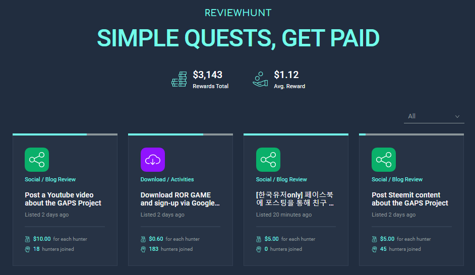 우선 직장인이 가장 소중히 하는 리소스는 시간입니다. 즉 많은 시간을 들여서 부업을 할 수 없는 관계로 빠르고 간편하게 부업을 통해서 조금씩이라도 핸드폰을 통해서 안전하게 돈을 벌 수 있다면 그만큼 이상적인 것은 없을 것입니다. 리뷰헌트의 경우는 마케팅을 원하고 이에 따른 행동기반 액션을 원하는 의뢰자와 원하는 의뢰를 온라인으로 간편하게 들어주는 온라인 마케팅용 크몽과 비슷하다고 보시면 됩니다. 즉, 누구라도 예를 들어서 자기 포스팅 방문자수를 늘리고자 하거나 한다면 간편하게 빠르게 타깃해서 요청을 할 수 있는 온라인 마케팅 잡보드라고 생각하시면 됩니다.