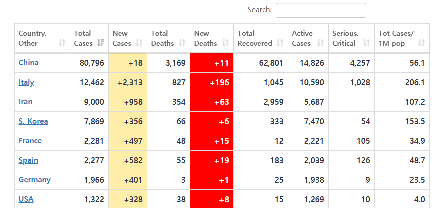최초 포스팅 이후 이태리와 독일, 프랑스등에서도 많은 확진자들이 나오기 시작하면서 더욱 많은 데이터가 집계되고 있습니다. 하지만 그와중에도 압도적인 많은 검사를 바탕으로 전세계에서도 현재로는 가장 신뢰할 수 있는 데이터기반을 가지고 있는 것은 대한미국이라고 봐도 무방합니다.