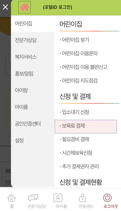 - 오른쪽 상단 메뉴 -> 어린이집 -> 보육료 결제를 선택하시면 됩니다.