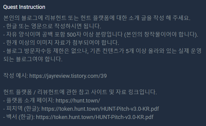 방문자수의 급증을 확인하기 위해서 리뷰헌트 홈페이지도 보고, 퀘스트를 진행했던 사용자들의 패턴도 봤는데, 처음에는 정확한 출처를 알 수 가 없었는데, 다른 소스를 통해서 한 유튜버가 리뷰헌트 자체를 리뷰했다는 소식이 전해졌다. 또한 리뷰헌트에서도 자체적으로 리뷰헌트를 블로그로 알리는 퀘스트를 진행을 하면서 예시로 필자의 블로그에 나오는 글을 예로 들어줬다.