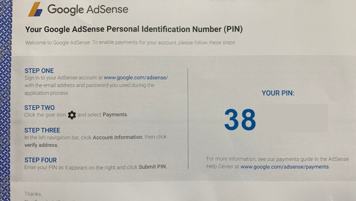필자의 경우는 구글 애드센스 승인후 약 한달있다가 우편물이 우편함에 도착되어 있었습니다. 우편물이 도착하고 나서 3면을 뜯고 우편물을 열게 되면 안에 큰 글씨로 PIN 번호가 나와 있습니다.