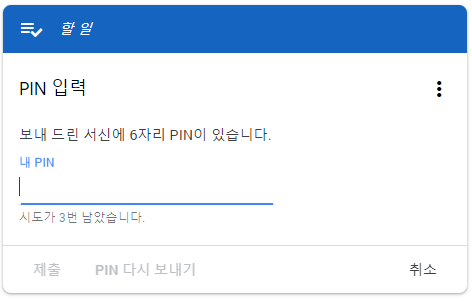 이 화면이 보이면 또한 메인화면중에 카드 형식으로 PIN을 입력하는 란이 보이고, 여기서 PIN번호를 입력할 수 있습니다. 번호 입력을 최대 3번까지 할 수 있음으로 틀리지 않고 입력하는 것이 중요합니다.