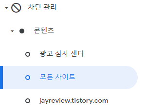 중요한 것은 다른 주제로 여러 사이트를 관리를 하고 있을 경우에는 전체 차단을 하게 되면 한 사이트는 광고 효율이 올라가나, 반대로 다른 사이트의 광고 효율이 떨어질 수도 있습니다. 이럴때는 차단관리에서 '모든 사이트'가 아니라 관리를 하고자 하는 해당 사이트를 눌러서 차단 관리를 해주면 됩니다. 다만 애드센스는 광고 효율에 대한 데이터는 '모든 사이트'를 바탕으로 제공하기 때문에, 각 사이트에 대한 효율 데이터는 볼 수 가 없습니다.