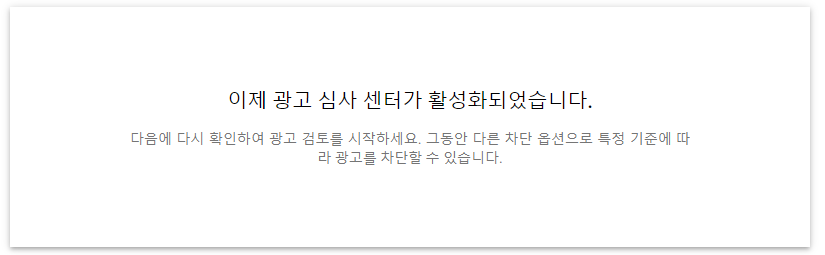 우선 애드센스 홈페이지로 이동을 해서 차단관리를 찾아서 클릭합니다. 처음 클릭했을 경우 광고 심사 센터를 활성화할 것인지를 문의합니다.