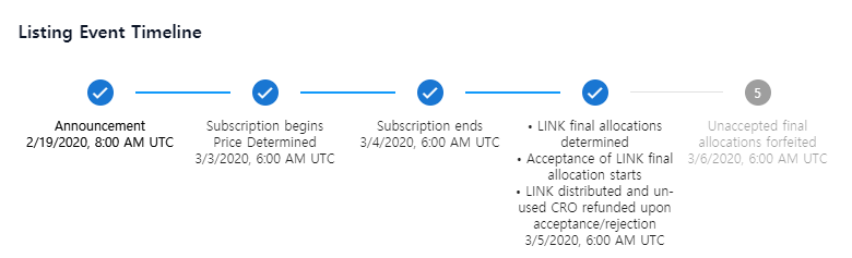 스테이킹한 CRO의 양에 따라 총 투자 가능한 CRO 금액도 매 이벤트마다 CRO의 가격에 따라서 변합니다. 지난 LINK 상장 이벤트 시에는 예를 들어 1만 CRO를 스테이킹 시 총 1만 9천 CRO를 투자할 수 있었습니다.